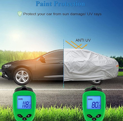 CARVITO :-Waterproof material - Keeps Car Dry & Clean in Rainy Season.Scratchproof material – Keeps Car safe from Cats & Dogs paw and Bird’s poop.Heatproof Material – Protect fading of Car Paint from harmful UV rays.Dustproof Material – Inside Cotton lining helps protect Car from Sand, dust, tree leaves.Windproof Design – Elastic is given on complete base of the Cover and there is a Buckle belt in the middle of the cover; it helps to hold the cover in wind.
